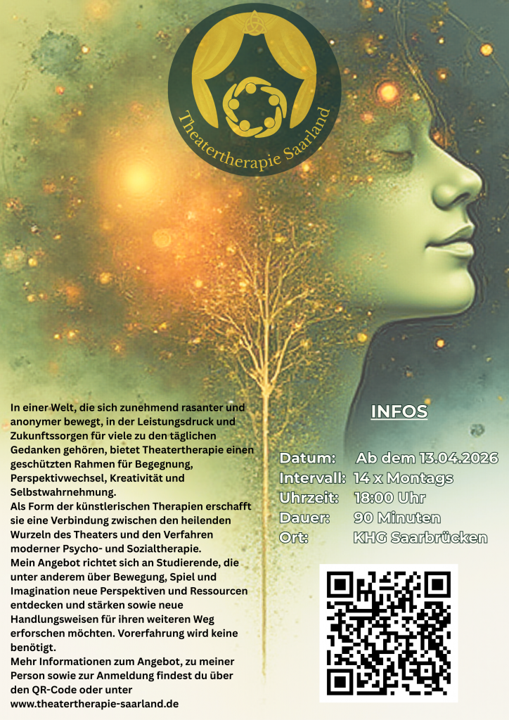 Ab dem 13.04.2026 biete ich für 14 Einheiten montags eine Theatertherapiegruppe für Studierende im Saarland in den Räumlichkeiten der KHG auf dem Universitätscampus Saarbrücken an.
